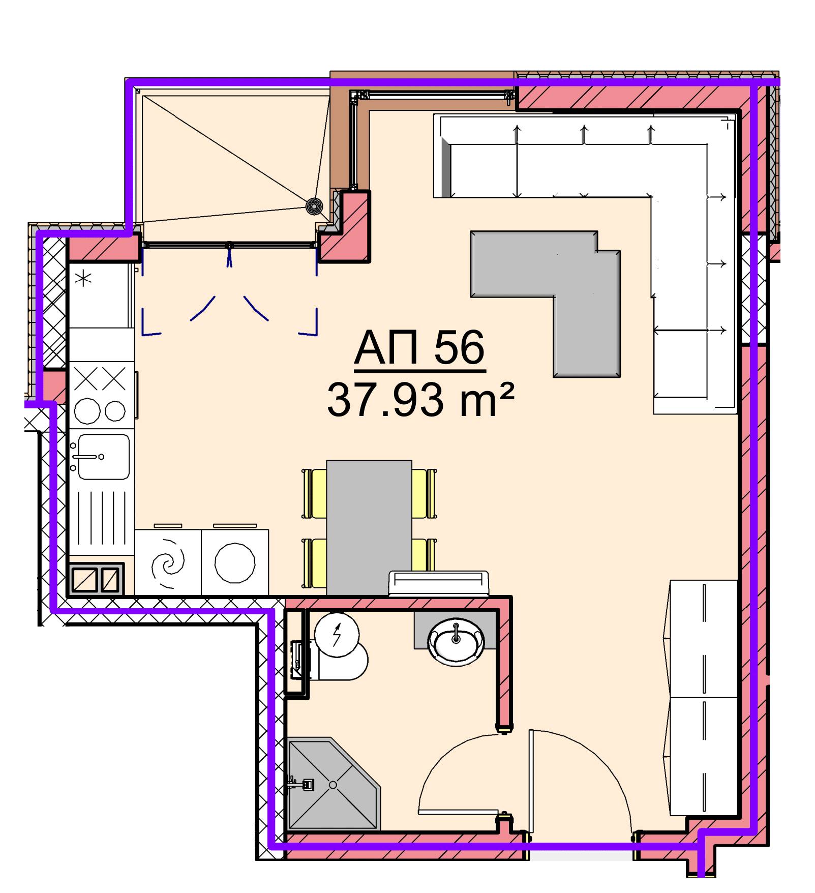 Wohnung – Wohnzimmer mit Küchenzeile, Bad mit WC und Balkon