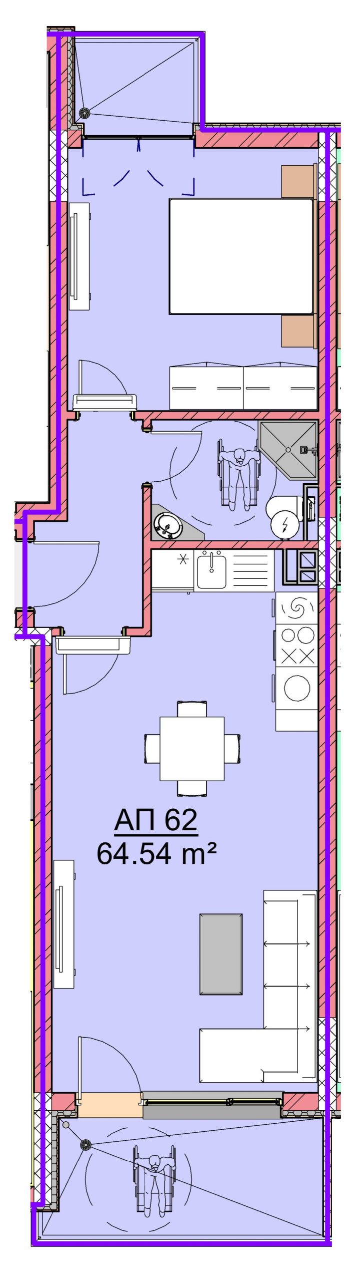 Wohnung – Wohnzimmer mit Küchenzeile, Schlafzimmer, Bad mit WC, Flur und 2 Balkone