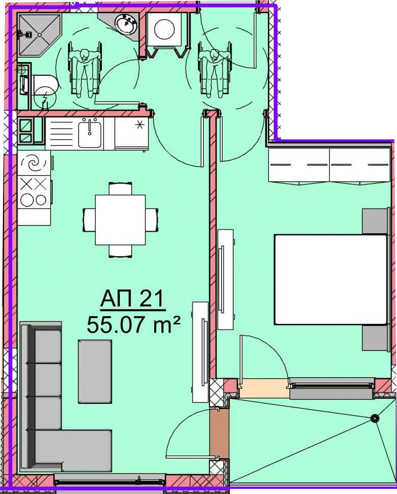 Apartment – living room with kitchenette, bedroom, bathroom with toilet, corridor, and terrace.