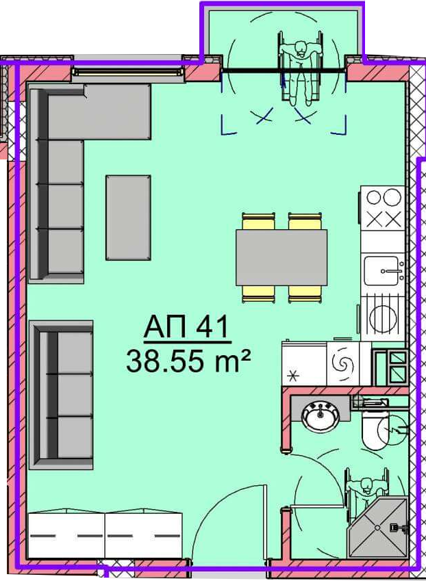 Apartment – living room with kitchenette, bathroom with toilet, and terrace.