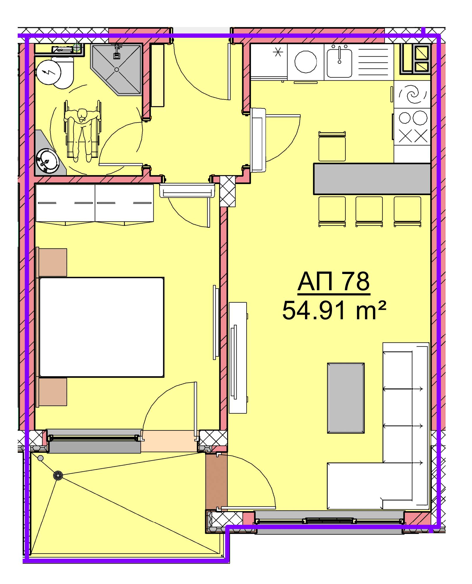 Apartment – Living room with kitchenette, bedroom, bathroom with toilet, corridor, and terrace