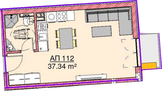 Apartment – living room with kitchenette, bathroom with toilet and terrace.