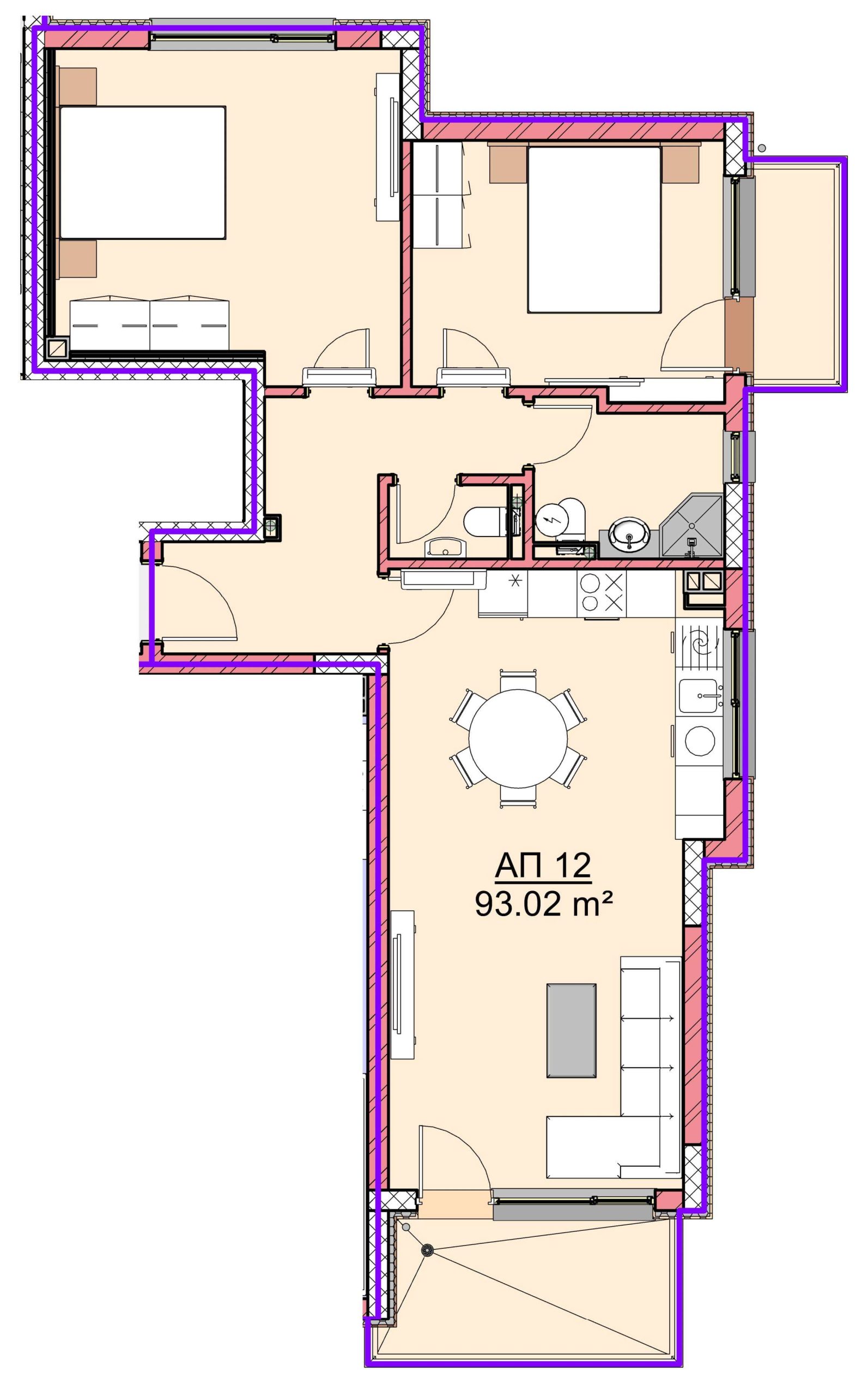 Апартамент- Дневна с кухненски бокс, 2 спални, баня с тоалетна, коридор и 2 тераси