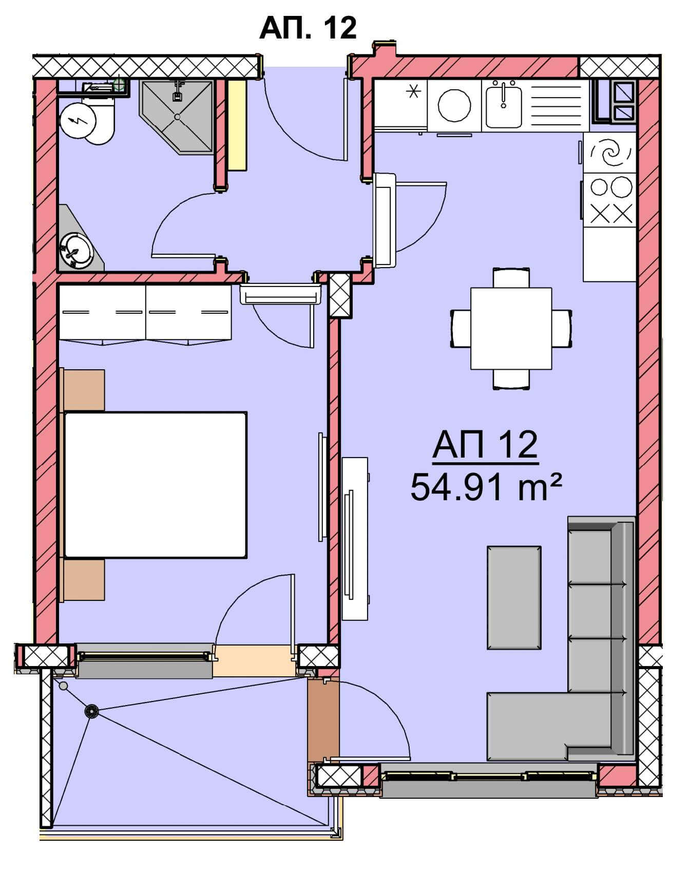 Апартамент- Дневна с кухненски бокс, спалня, баня с тоалетна, коридор и тераса.