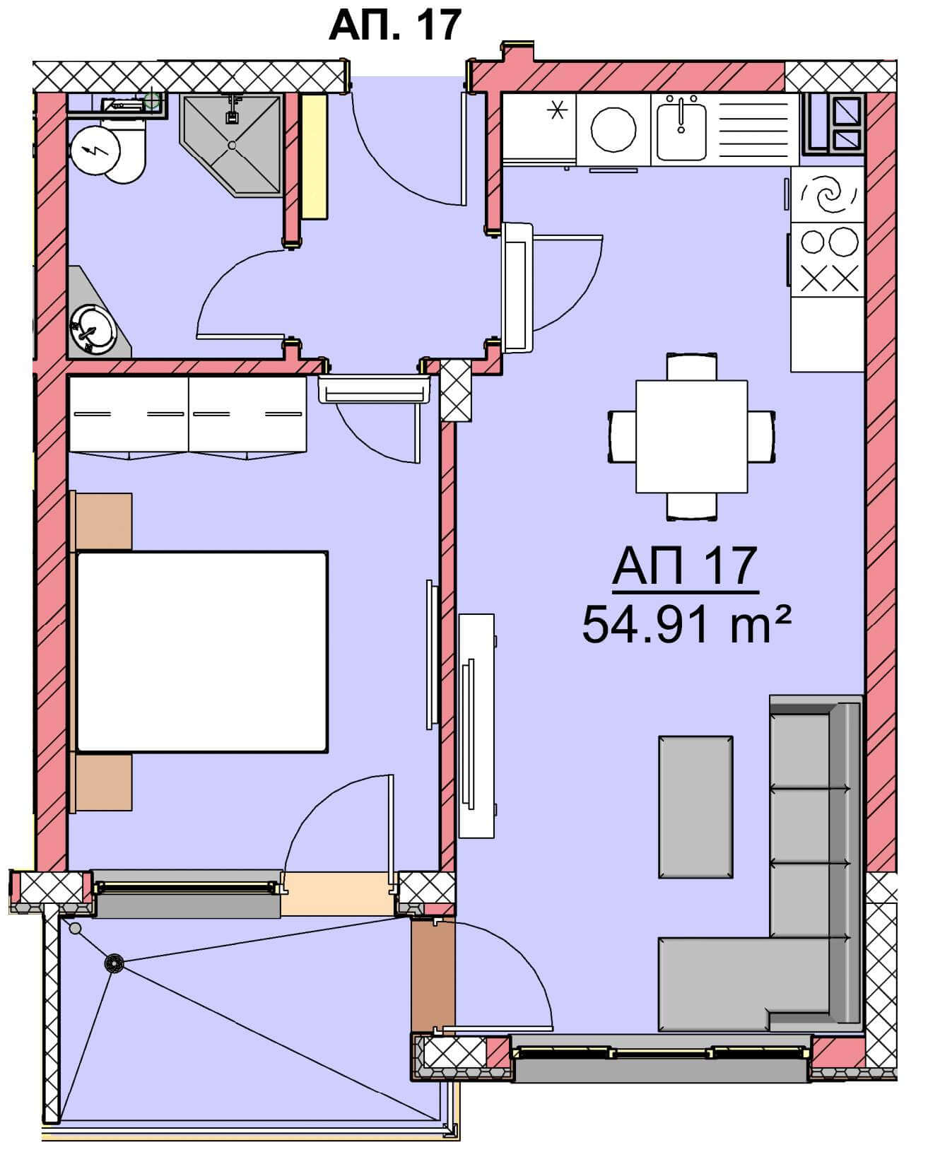 Апартамент- Дневна с кухненски бокс, спалня, баня с тоалетна, коридор и тераса.