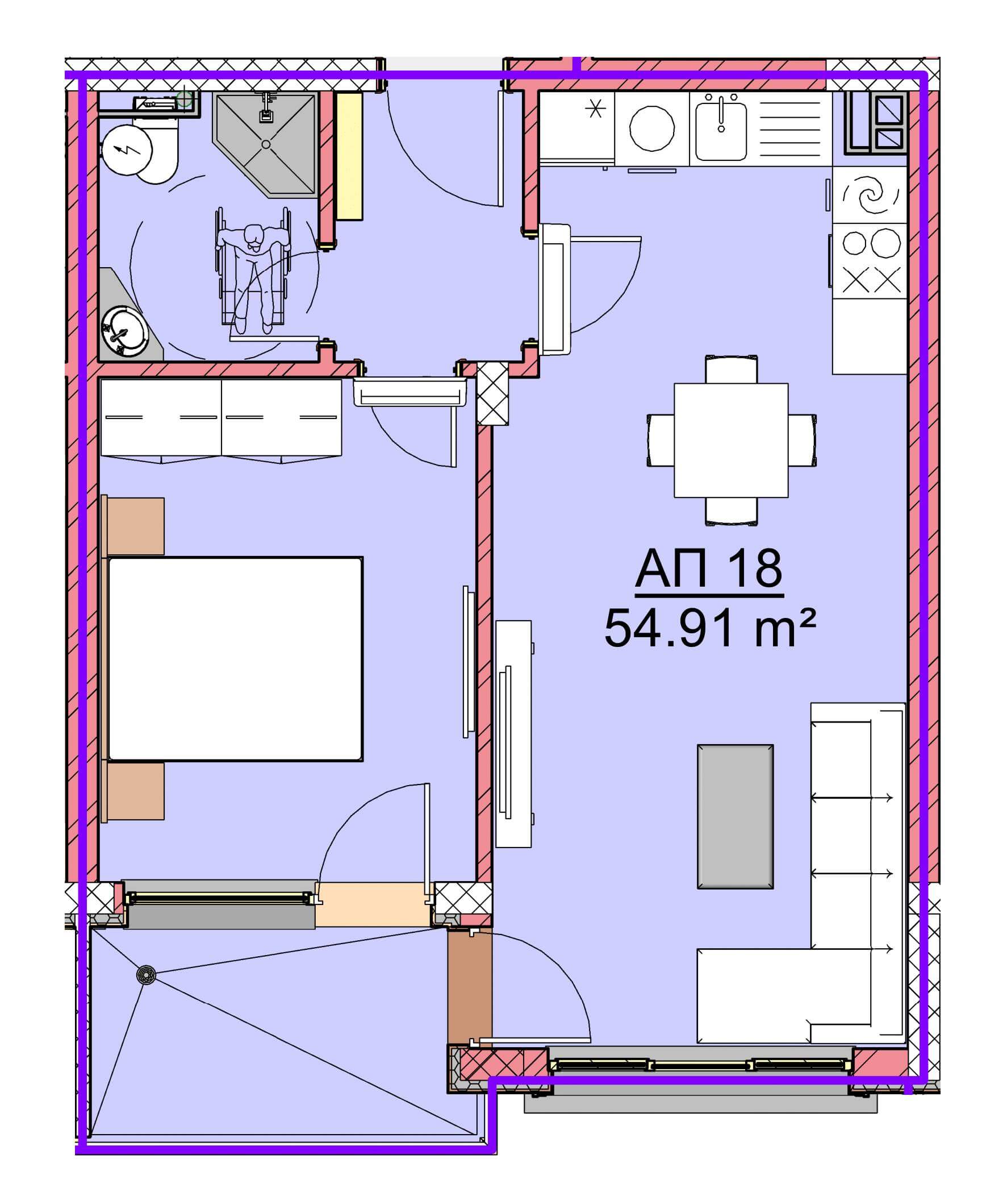 Апартамент- Дневна с кухненски бокс, спалня, баня с тоалетна, коридор и тераса