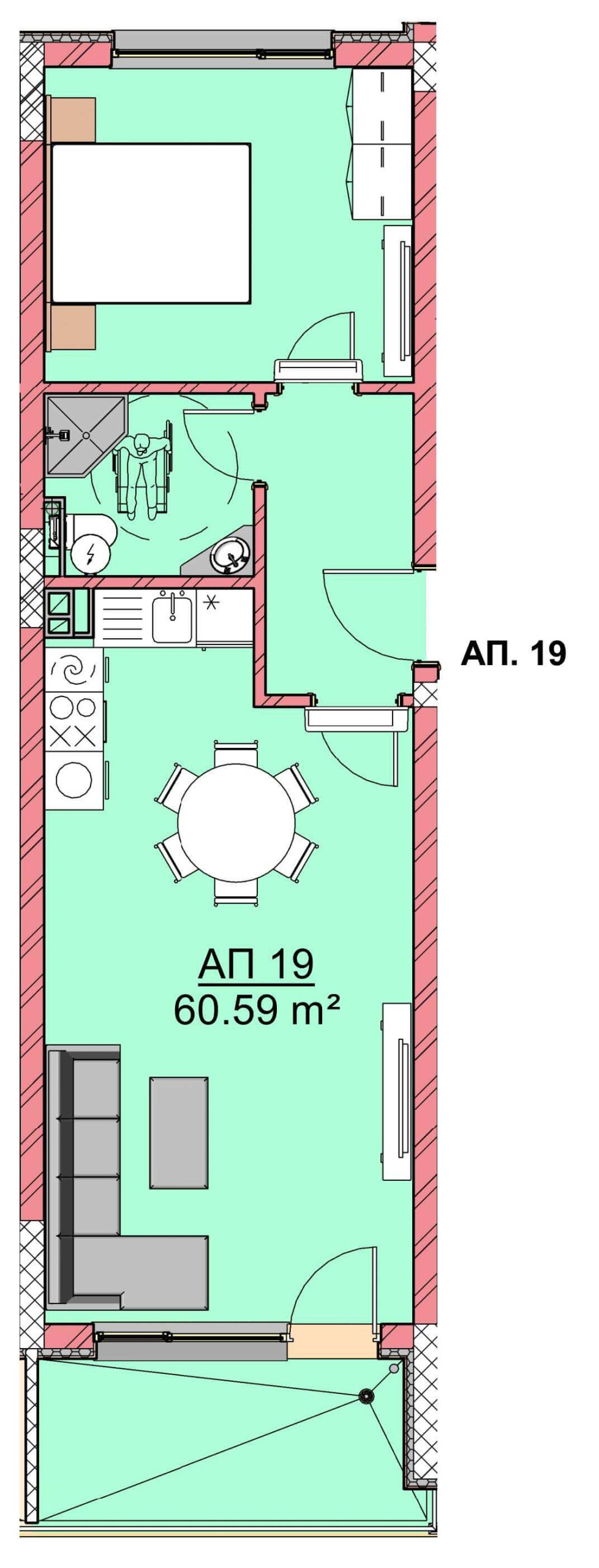 Апартамент- Дневна с кухненски бокс, спалня, баня с тоалетна, коридор и тераса.