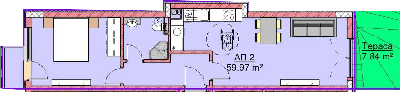Апартамент – дневна с кухненски бокс, спалня, баня с тоалетна, коридор, тераса и двор 7,84 кв.м.