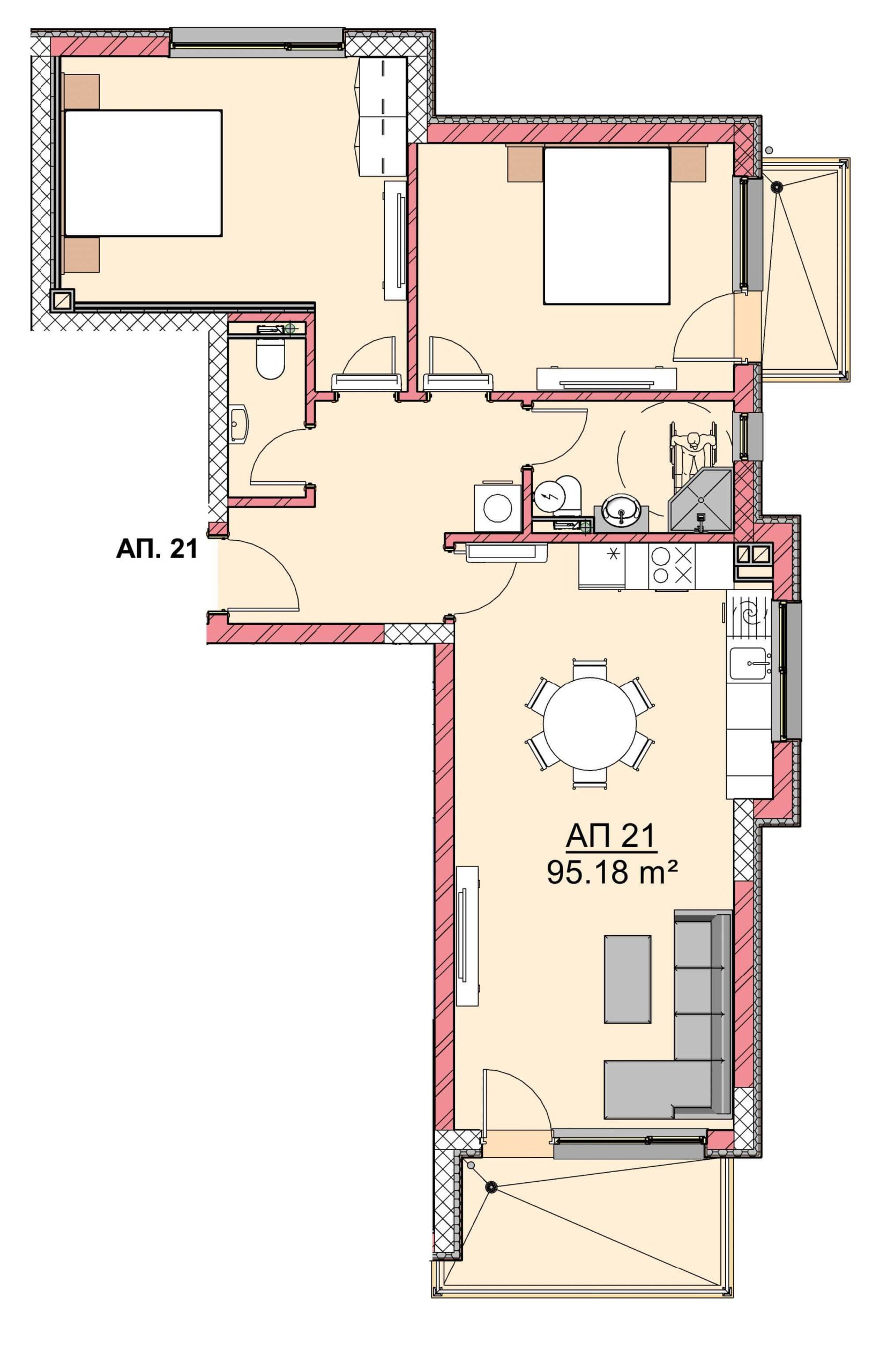Апартамент- Дневна с кухненски бокс, 2 спални, баня с тоалетна, тоалетна, коридор и 2 тераси.