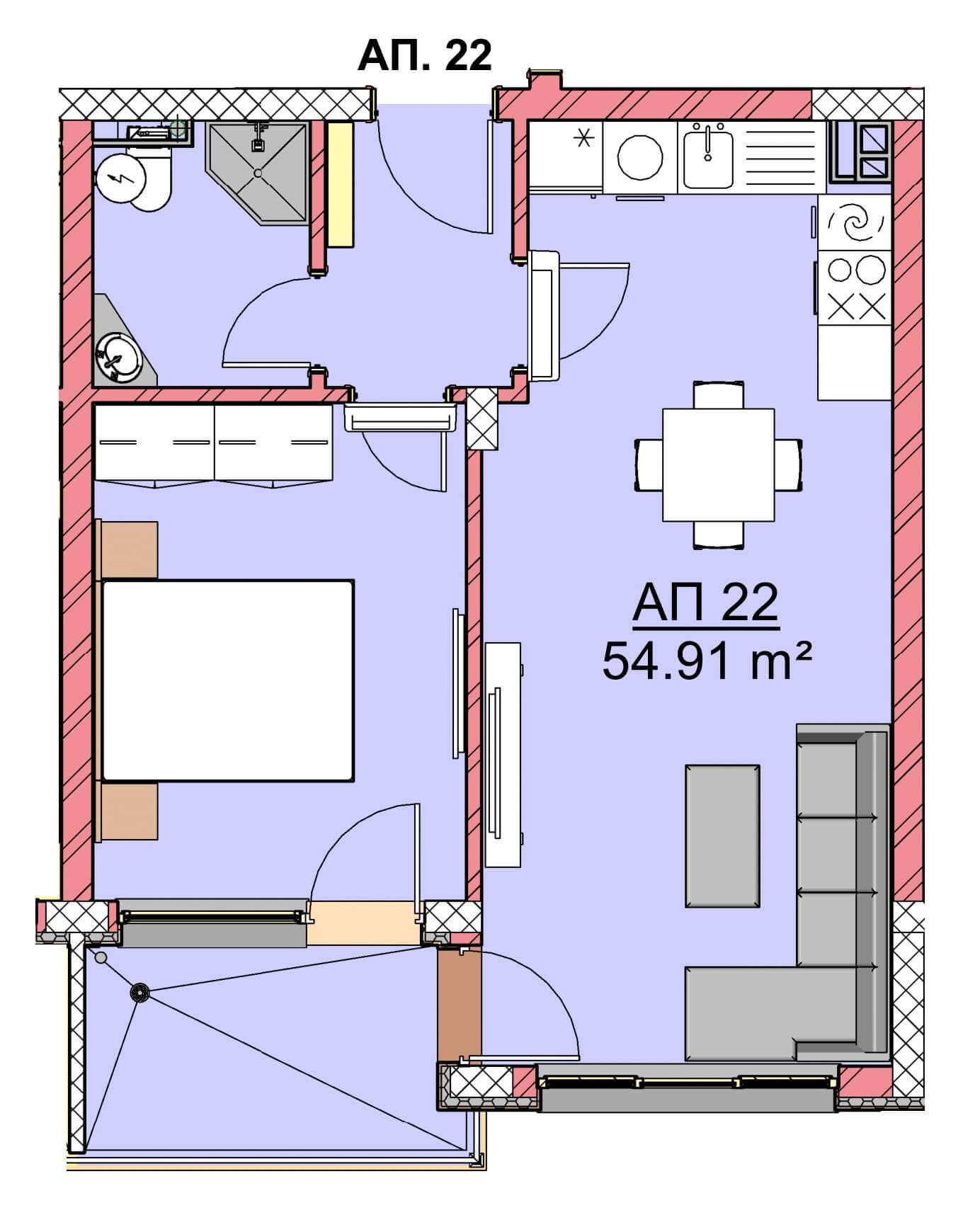 Апартамент- Дневна с кухненски бокс, спалня, баня с тоалетна, коридор и тераса.