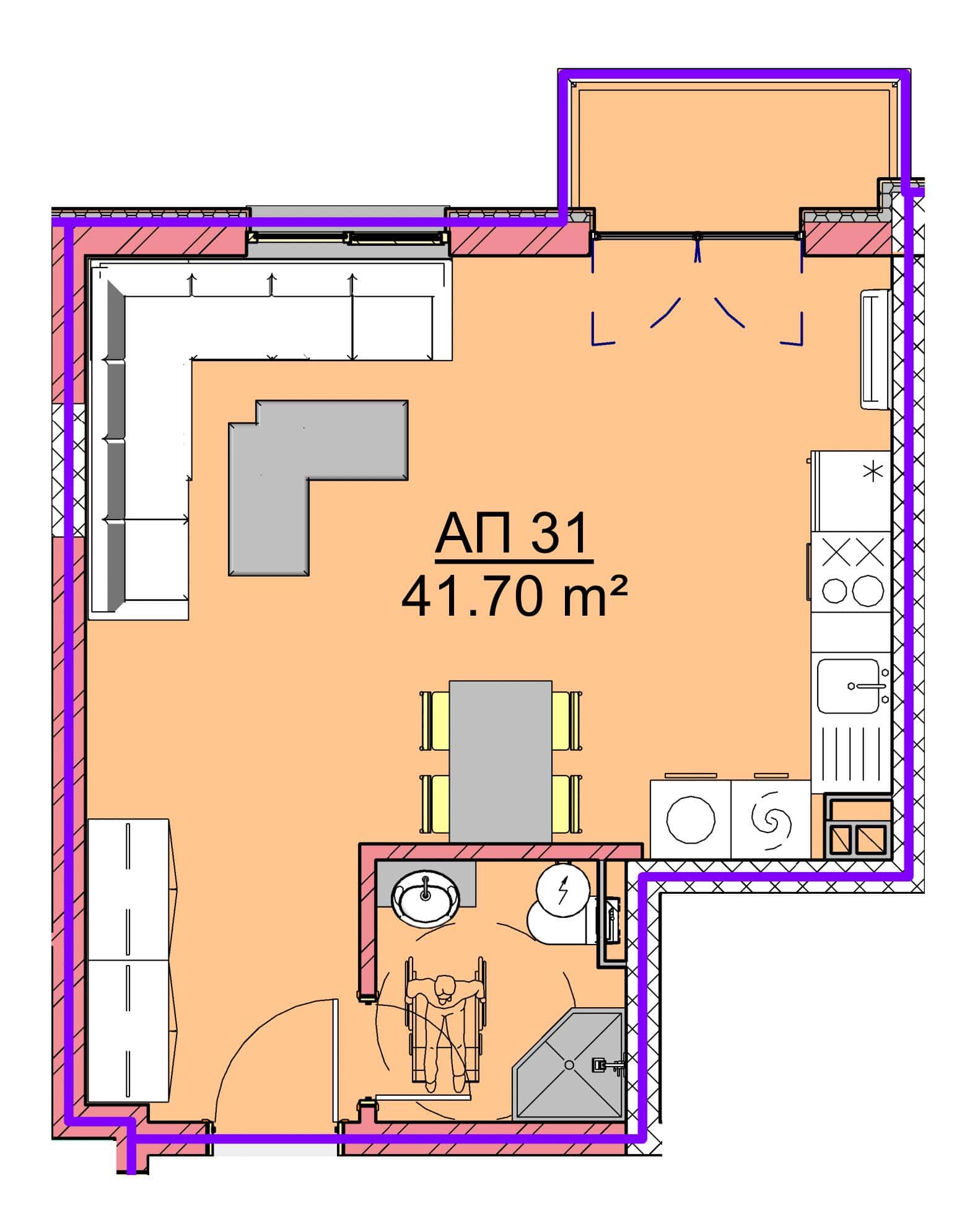 Апартамент- Дневна с кухненски бокс, баня с тоалетна и тераса