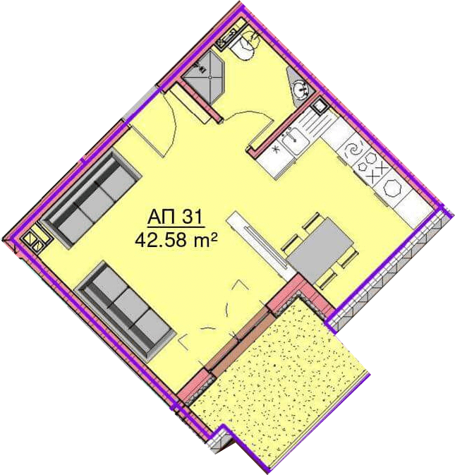 Апартамент – дневна с кухненски бокс, баня с тоалетна и терасa.