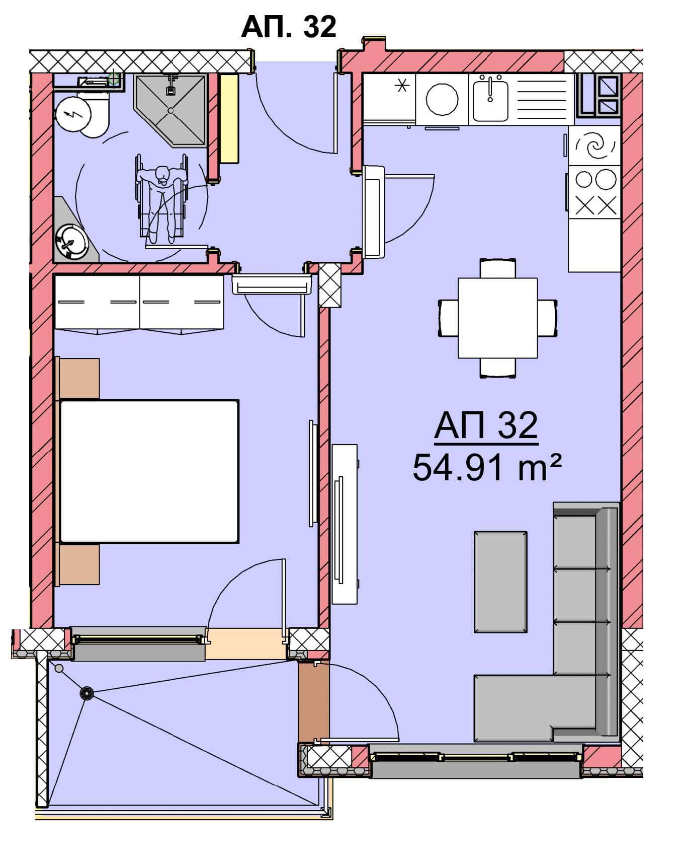 Апартамент- Дневна с кухненски бокс, спалня, баня с тоалетна, коридор и тераса.
