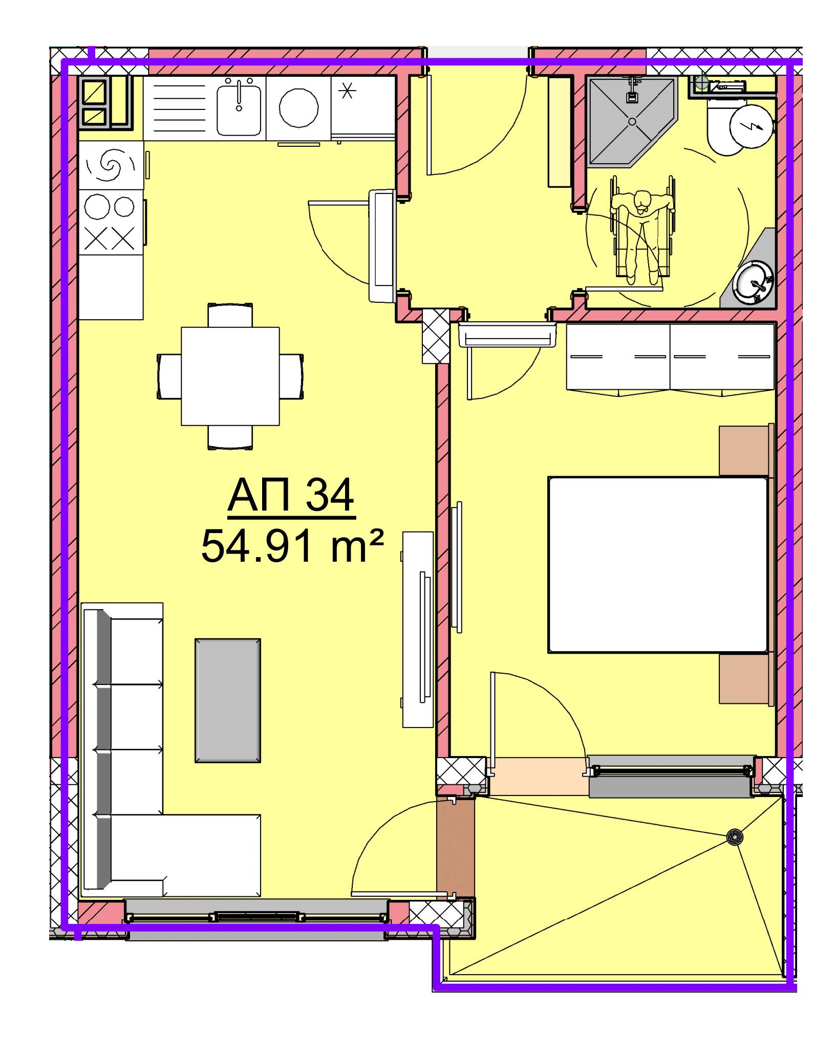 Апартамент- Дневна с кухненски бокс, спалня, баня с тоалетна, коридор и тераса