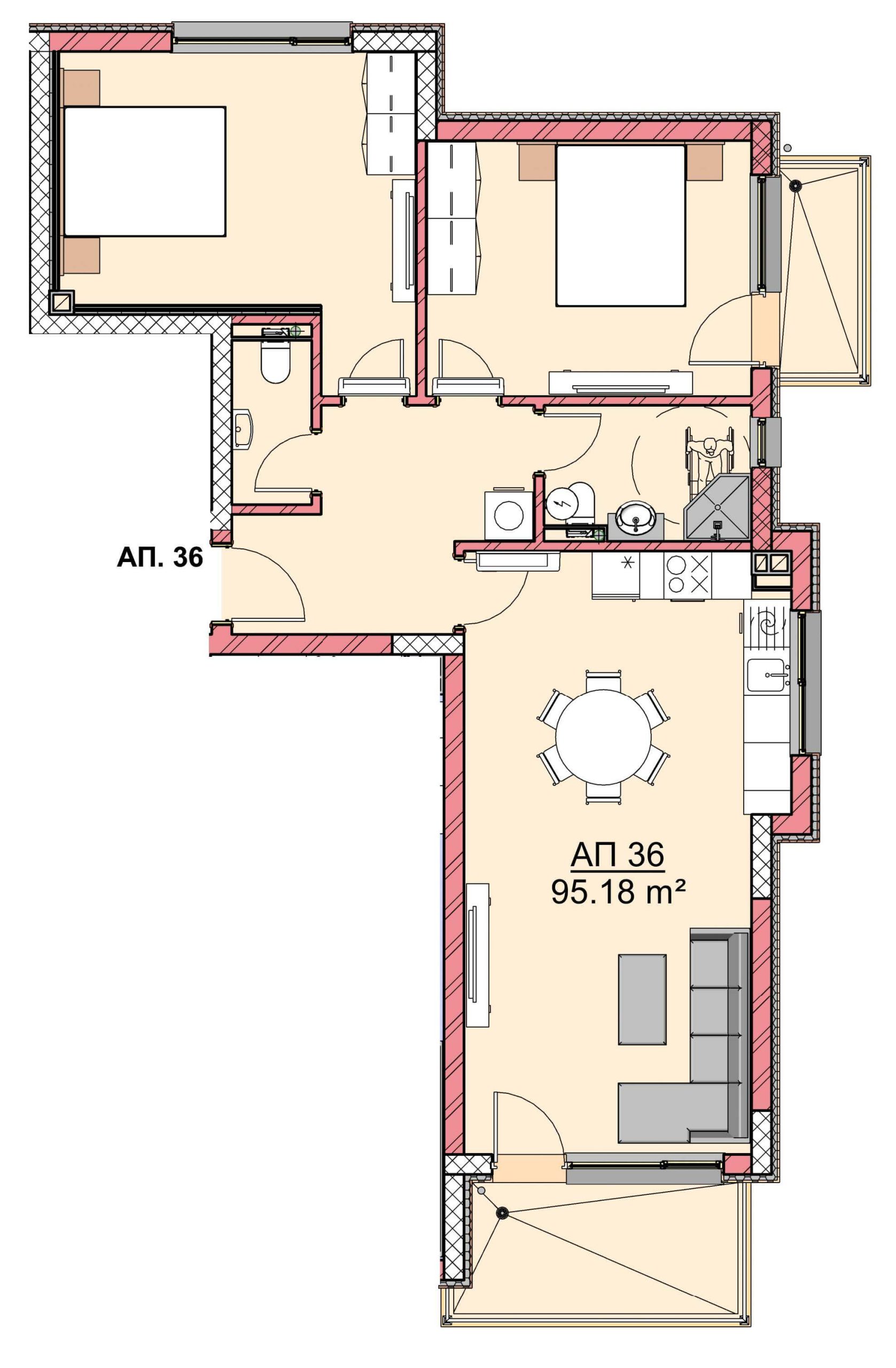 Апартамент- Дневна с кухненски бокс, 2 спални, баня с тоалетна, тоалетна, коридор и 2 тераси.