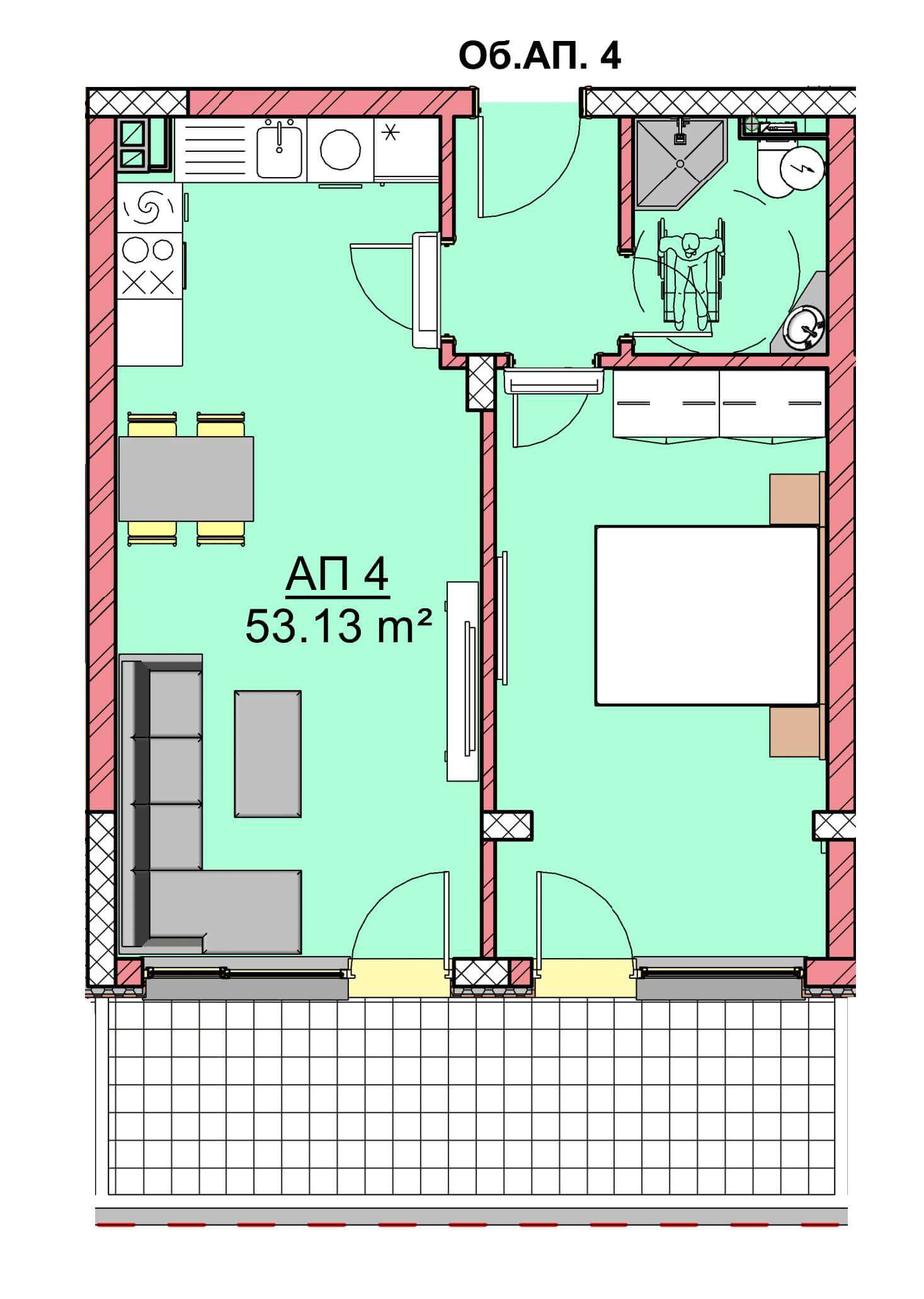 Апартамент- Дневна с кухненски бокс, спалня, баня с тоалетна, коридор и двор.
