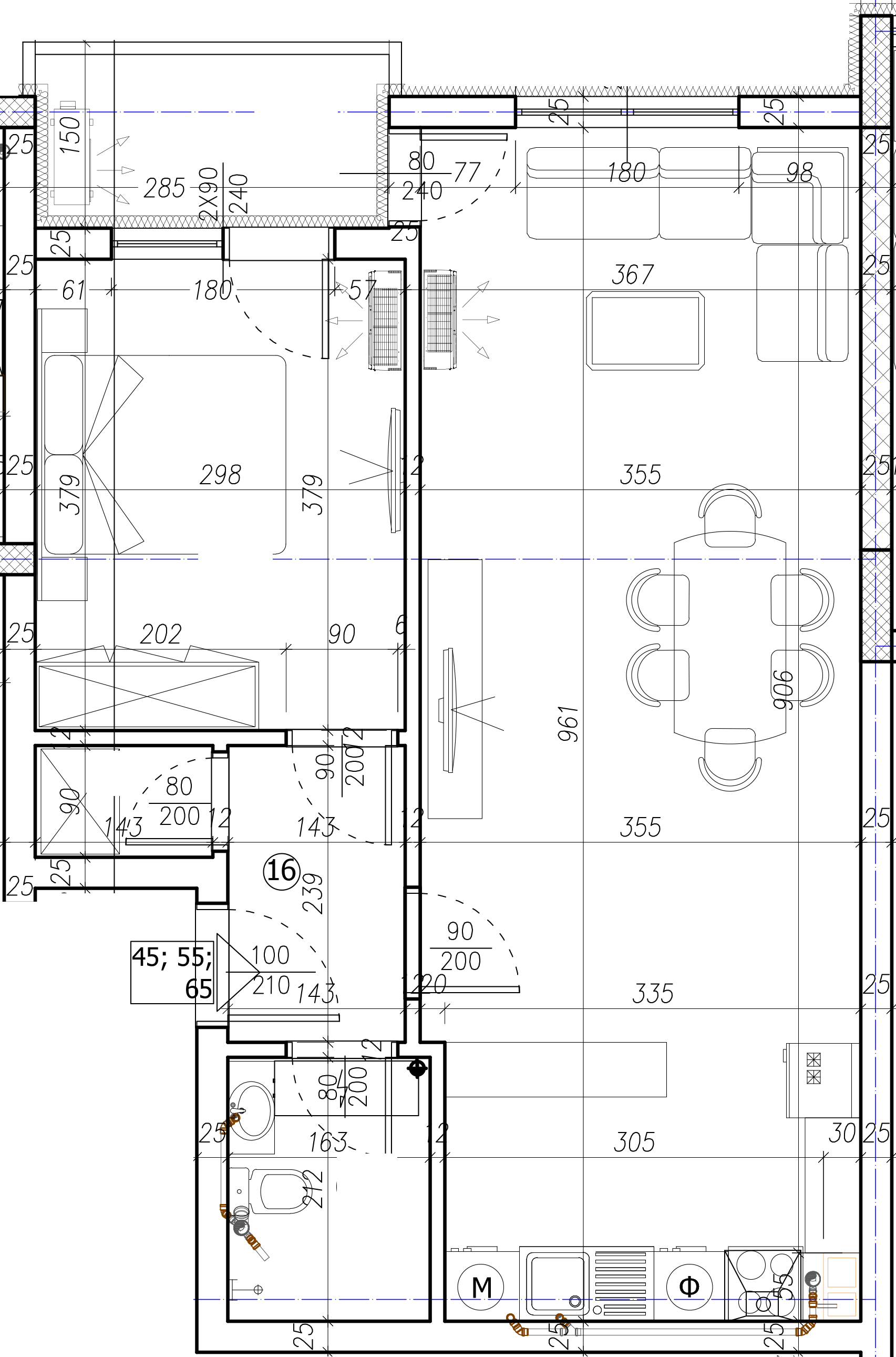 Апартамент- Дневна с кухненски бокс, спалня, баня с тоалетна, килер, коридор, балкон