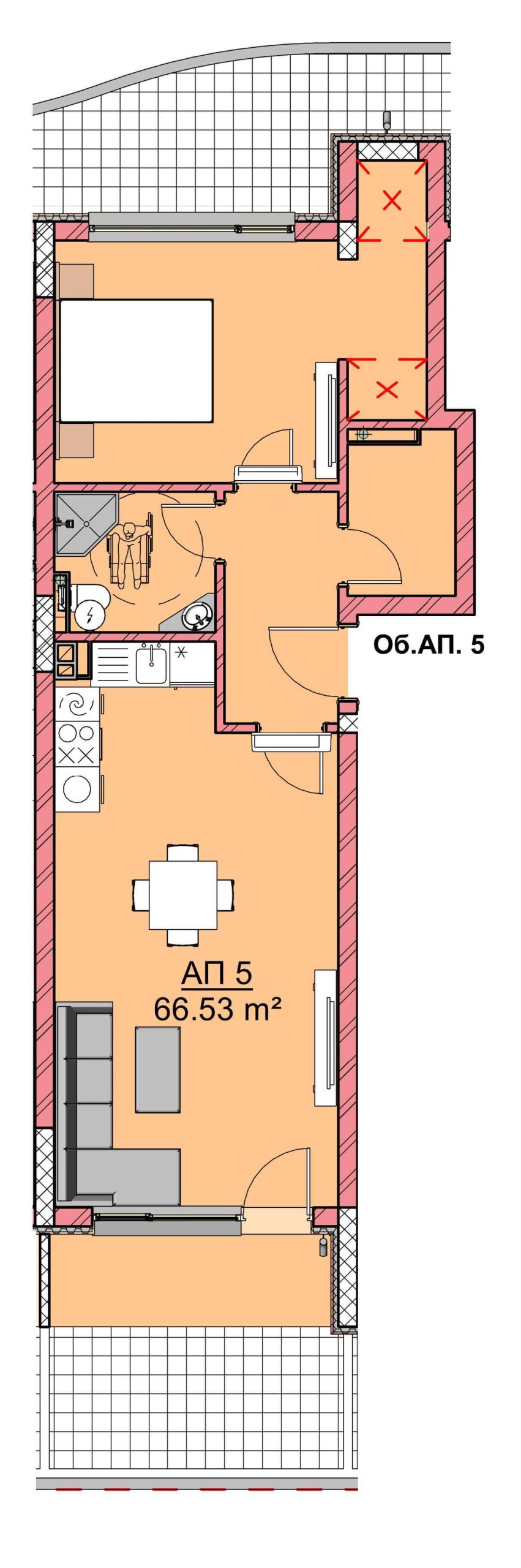 Апартамент- Дневна с кухненски бокс, спалня, баня с тоалетна, килер, коридор, тераса и двор.