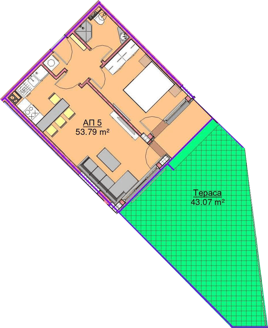 Апартамент – дневна с кухненски бокс, спалня, баня с тоалетна, коридор, тераса и двор 43,07 кв.м.