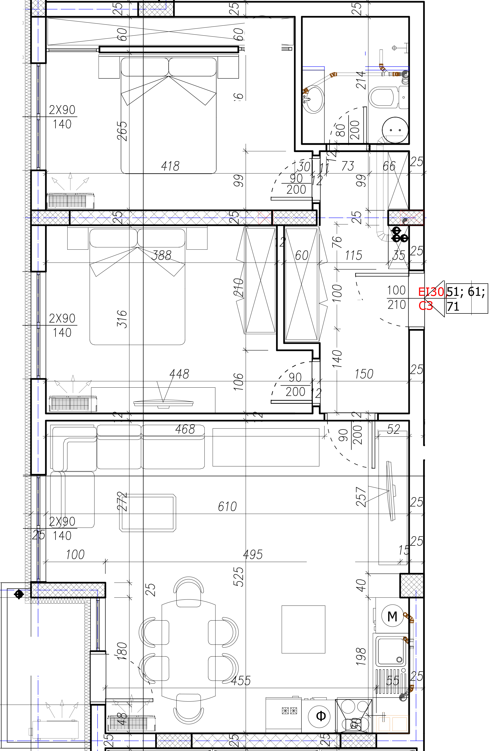 Апартамент- Дневна с кухненски бокс, 2 спални, баня с тоалетна, перално помещение, коридор, балкон