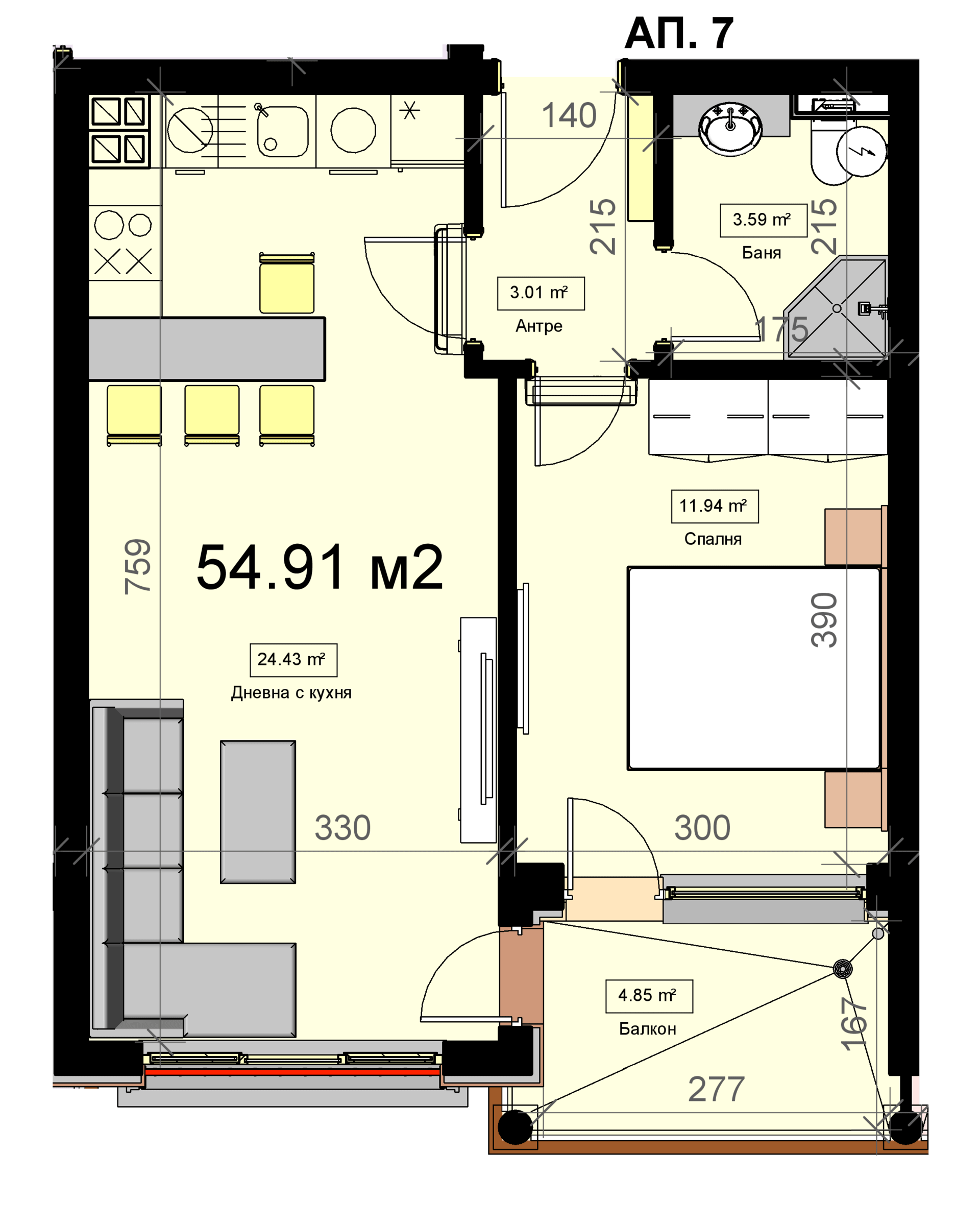 Апартамент- Дневна с кухненски бокс, спалня, баня с тоалетна, коридор, балкон