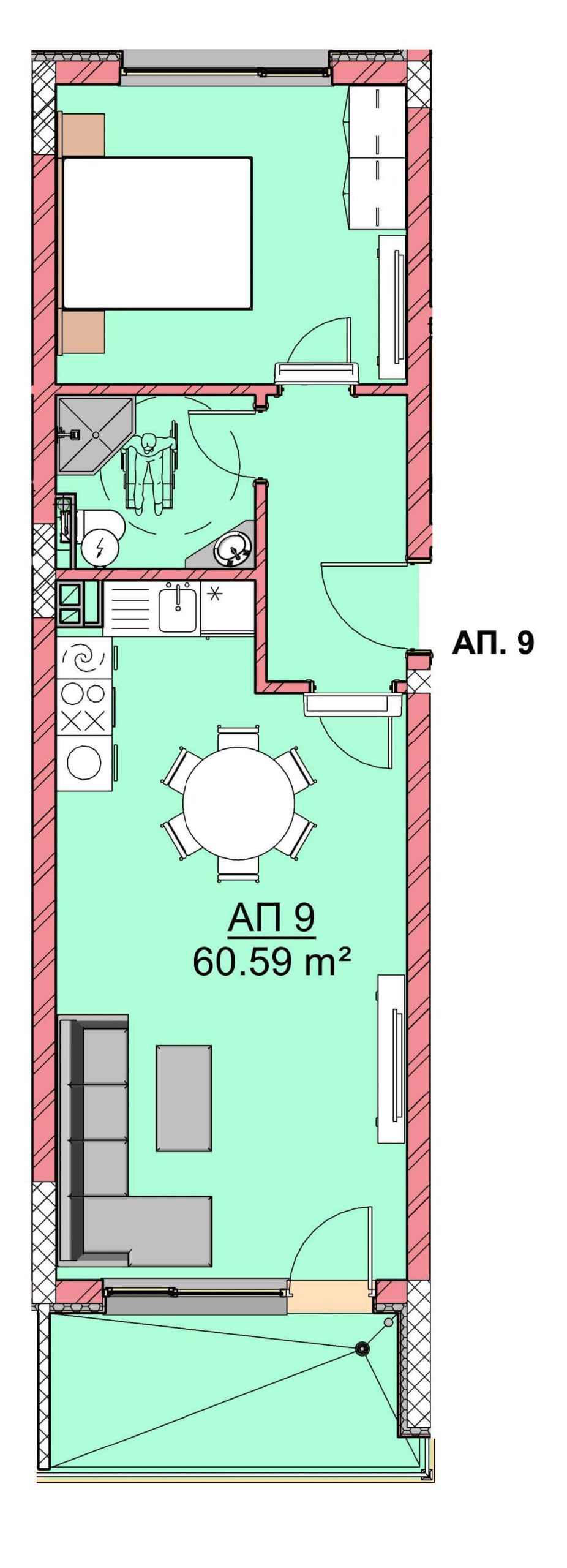 Апартамент- Дневна с кухненски бокс, спалня, баня с тоалетна, коридор и тераса.