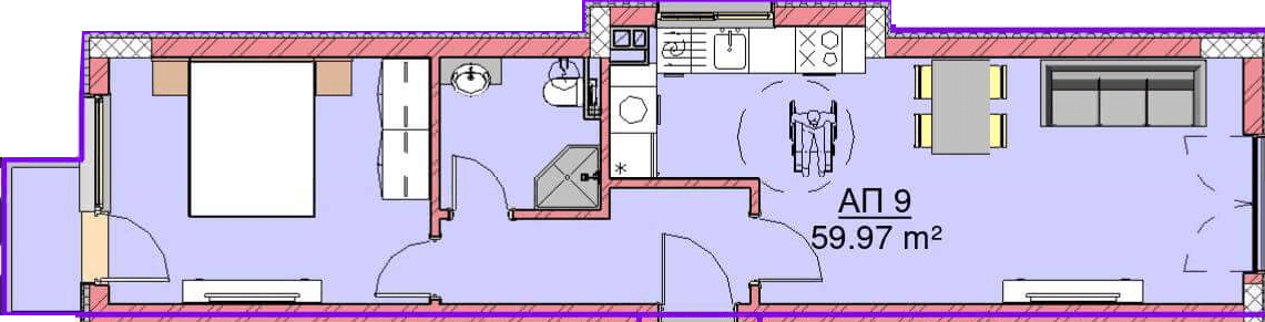 Апартамент – дневна с кухненски бокс, спалня, баня с тоалетна, коридор и тераса.