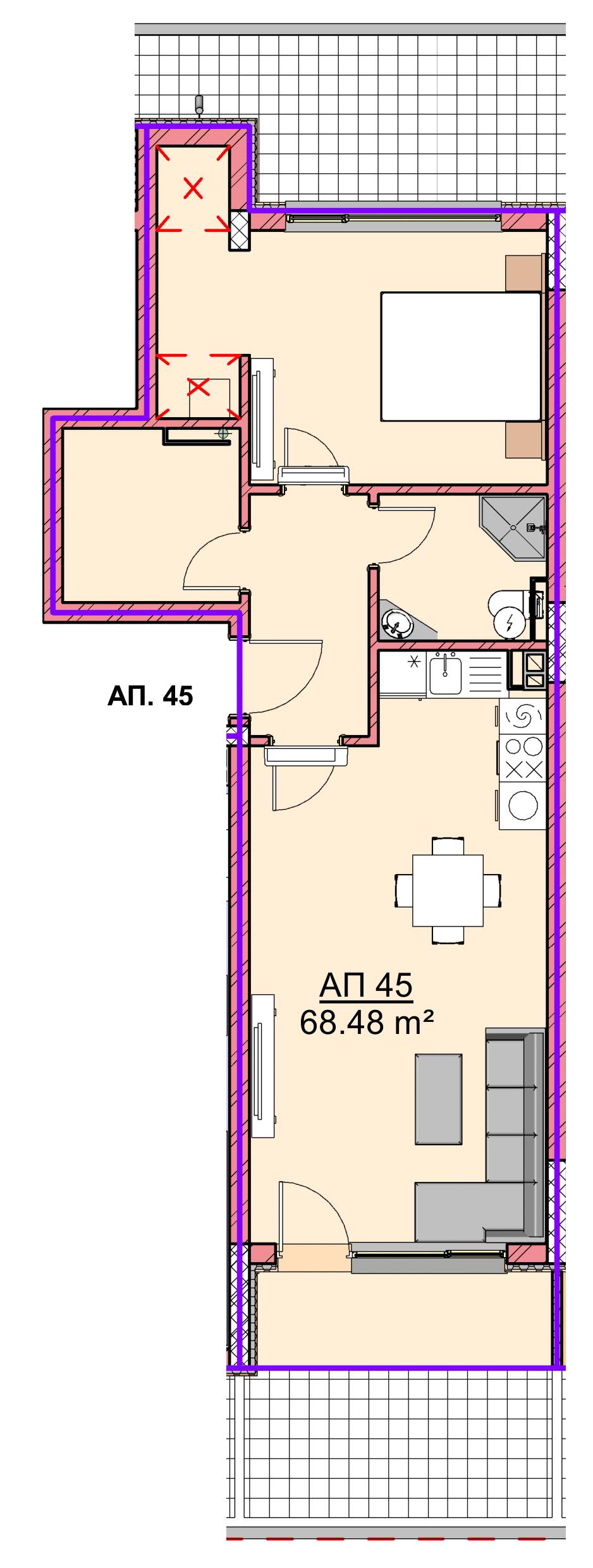 Апартамент- Дневна с кухненски бокс, спалня, баня с тоалетна, коридор, тераса и двор.