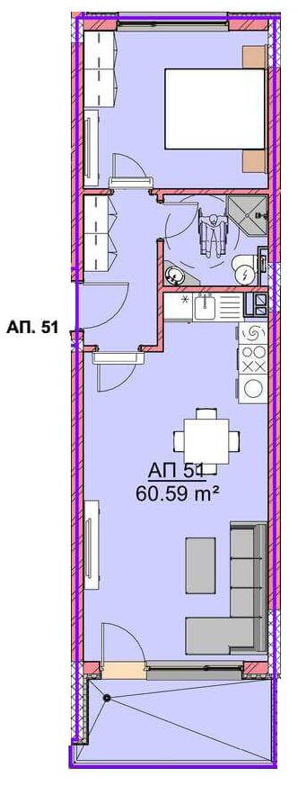 Апартамент- Дневна с кухненски бокс, спалня, баня с тоалетна, коридор и тераса.