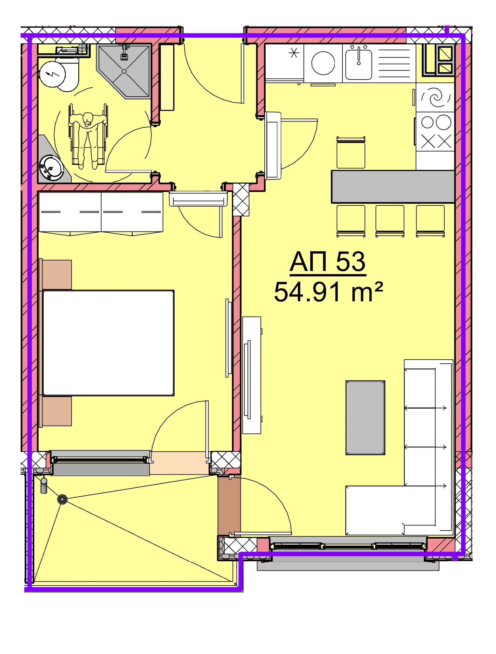 Апартамент- Дневна с кухненски бокс, спалня, баня с тоалетна, коридор и тераса