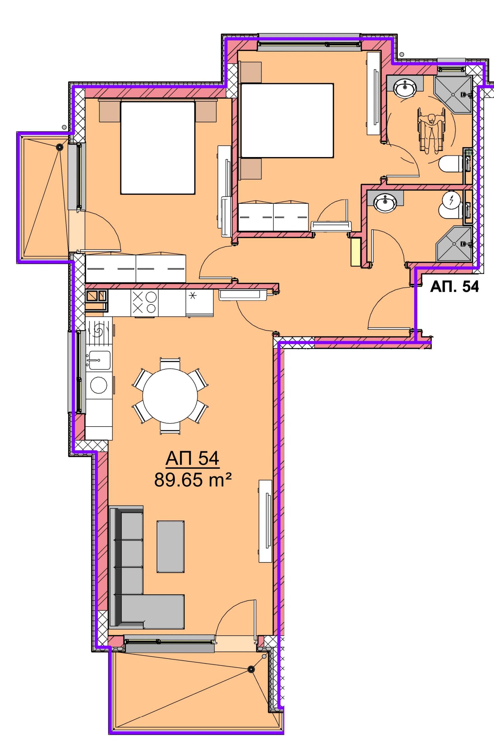 Апартамент- Дневна с кухненски бокс, 2 спални, 2 бани с тоалетна, коридор и 2 тераси.