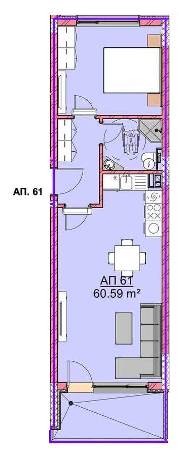 Апартамент- Дневна с кухненски бокс, спалня, баня с тоалетна, коридор и тераса.