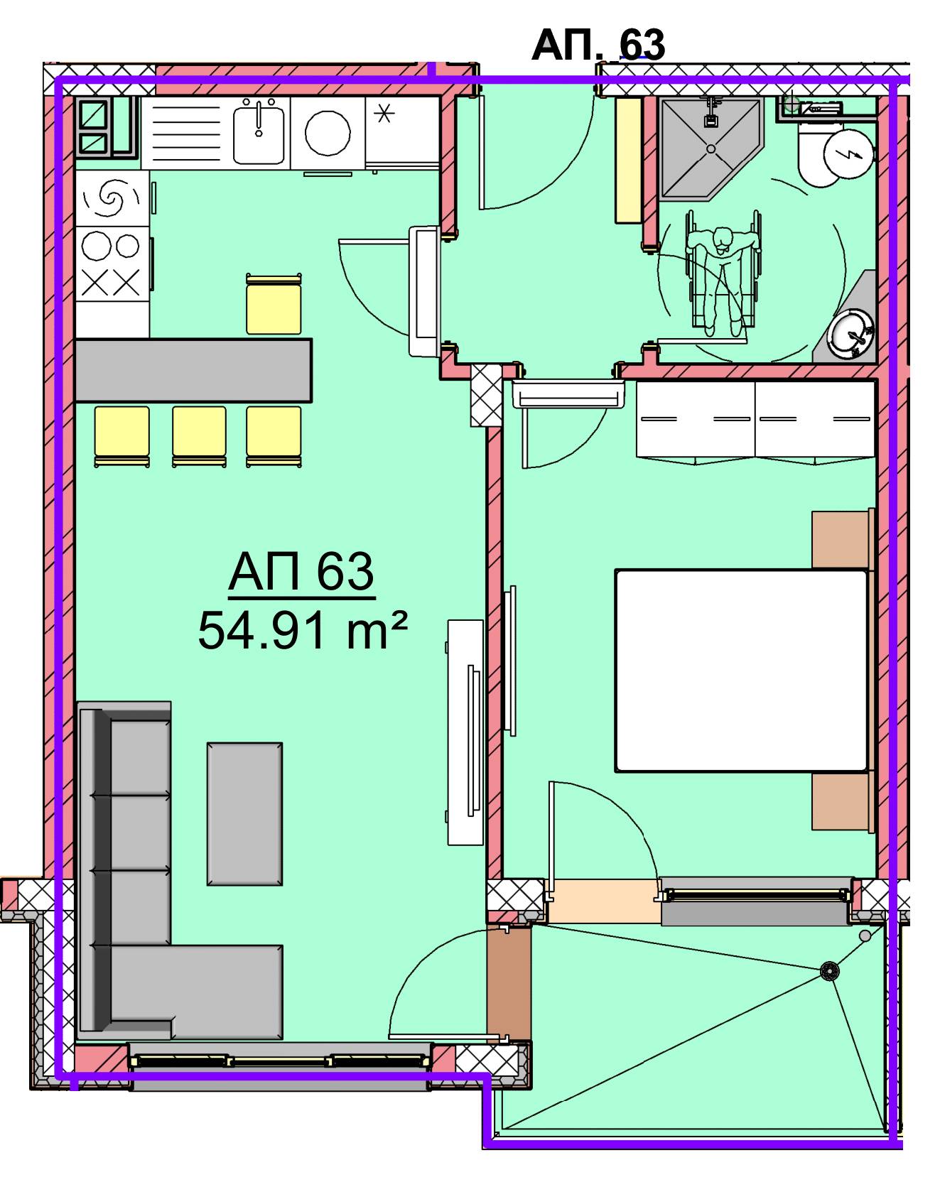 Апартамент- Дневна с кухненски бокс, спалня, баня с тоалетна, коридор и тераса.