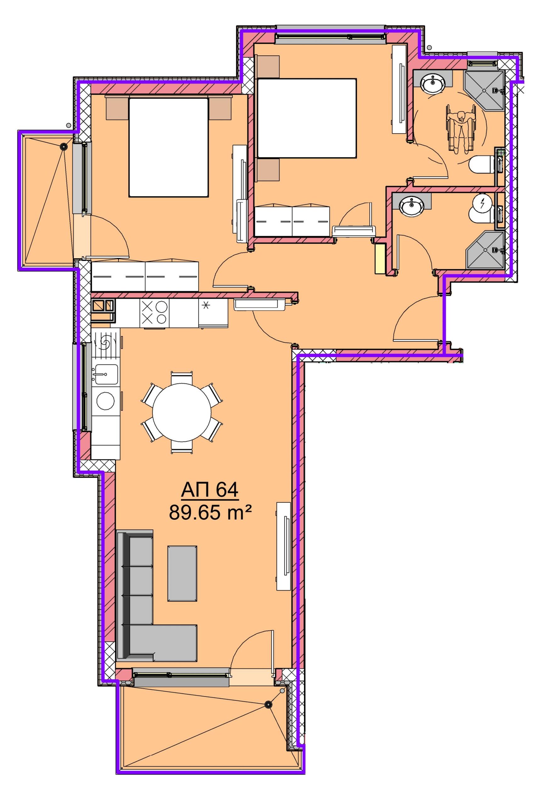 Апартамент- Дневна с кухненски бокс, 2 спални, 2 бани с тоалетна, коридор и 2 тераси.