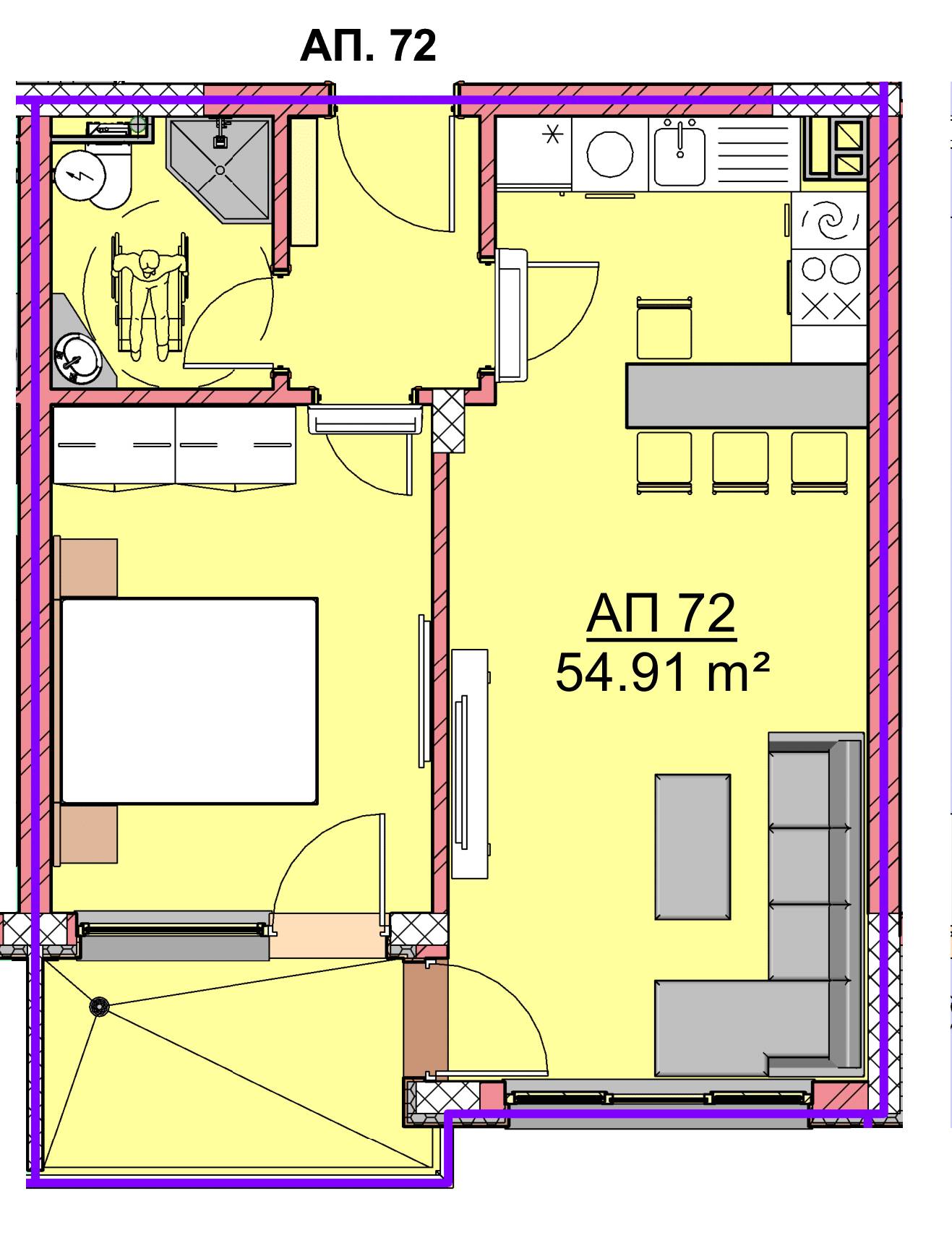 Апартамент- Дневна с кухненски бокс, спалня, баня с тоалетна, коридор и тераса.