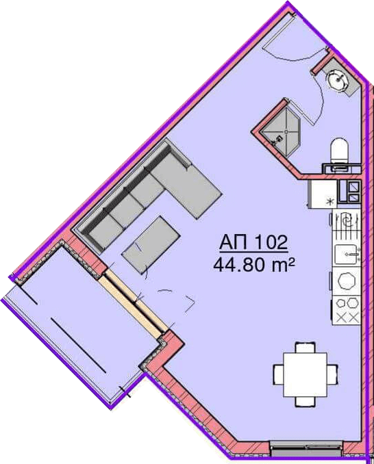 Апартамент – дневна с кухненски бокс, баня с тоалетна и терасa.