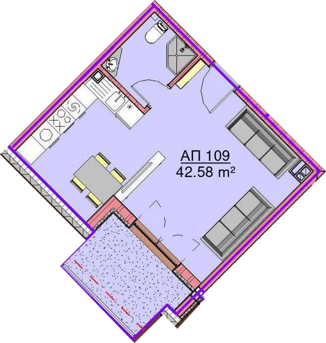 Апартамент – дневна с кухненски бокс, баня с тоалетна и терасa.