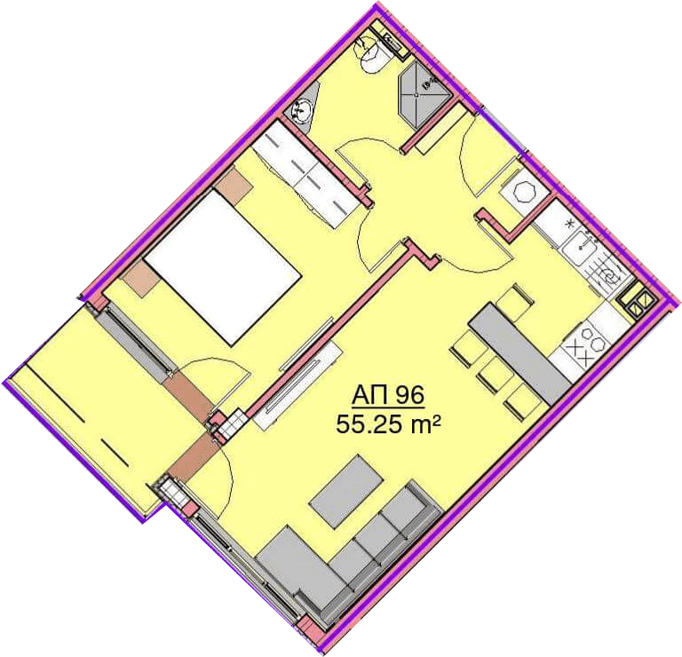 Апартамент – дневна с кухненски бокс, спалня, баня с тоалетна, коридор и тераса.