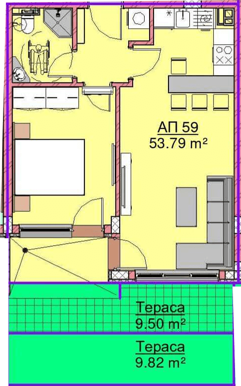 Квартира — гостиная с кухонным уголком, спальня, ванная с туалетом, коридор, терраса и двор 19,32 кв.м.