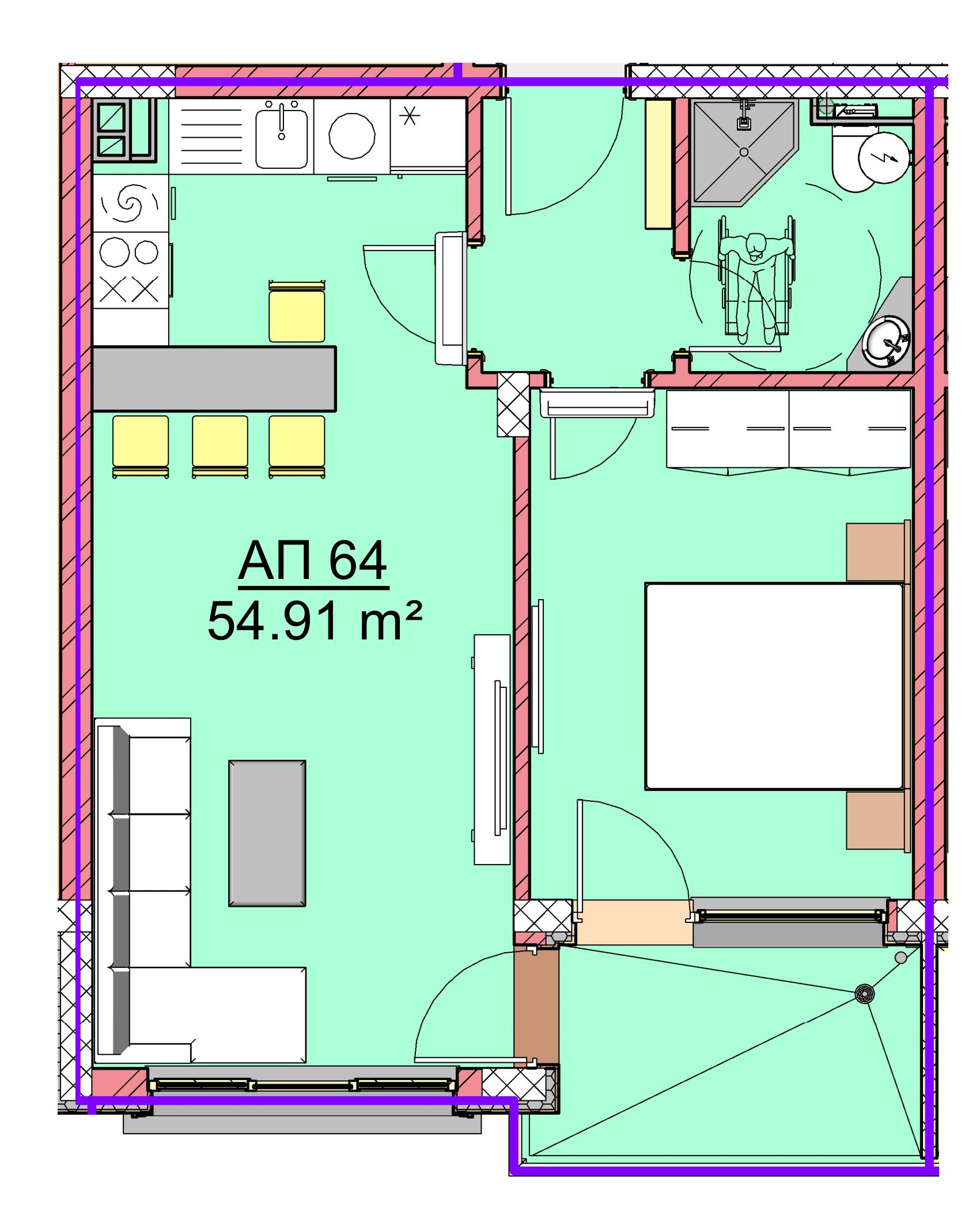 Квартира — Гостиная с кухонным блоком, спальня, ванная с туалетом, коридор и балкон