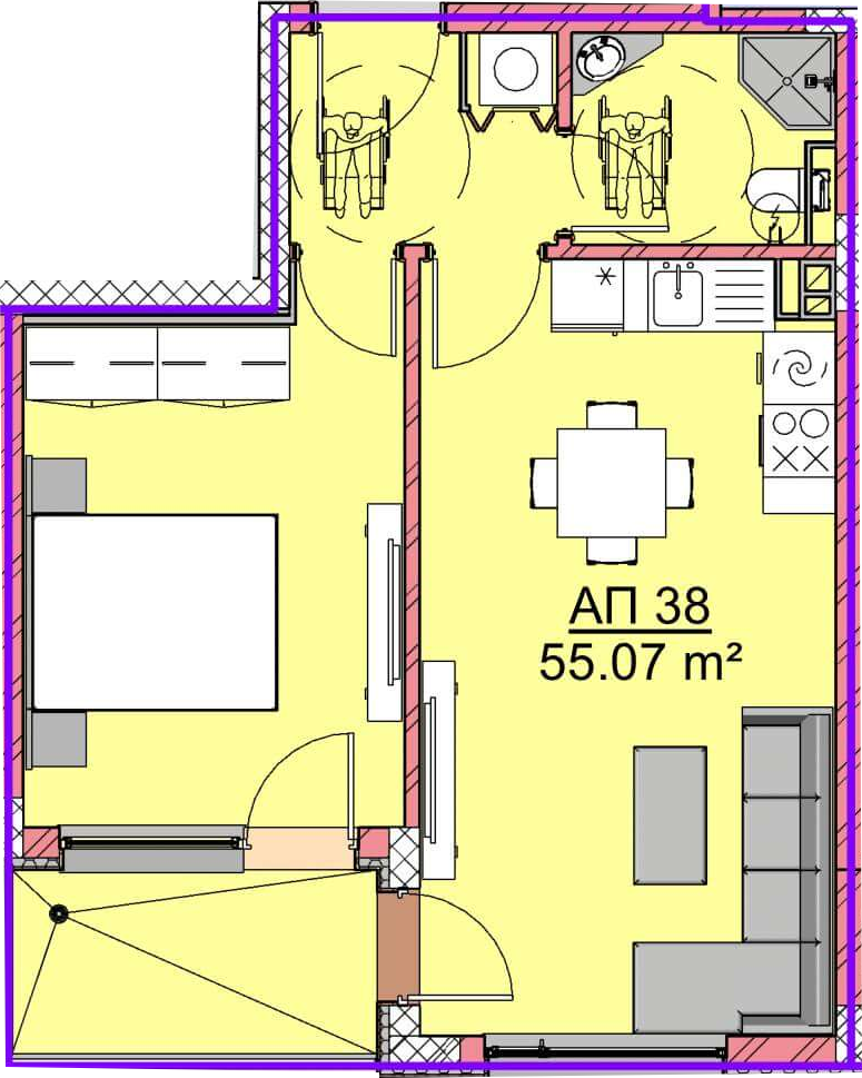 Daire – mutfaklı oturma odası, yatak odası, banyo ve tuvalet, koridor ve teras.