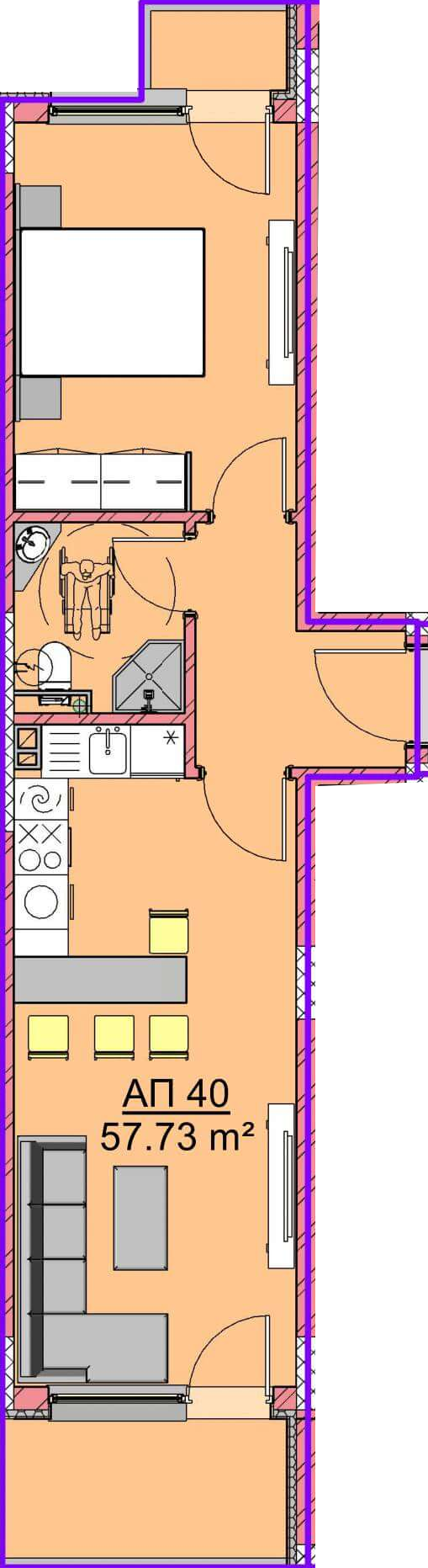 Daire – mutfaklı oturma odası, yatak odası, banyo ve tuvalet, koridor ve 2 teras.