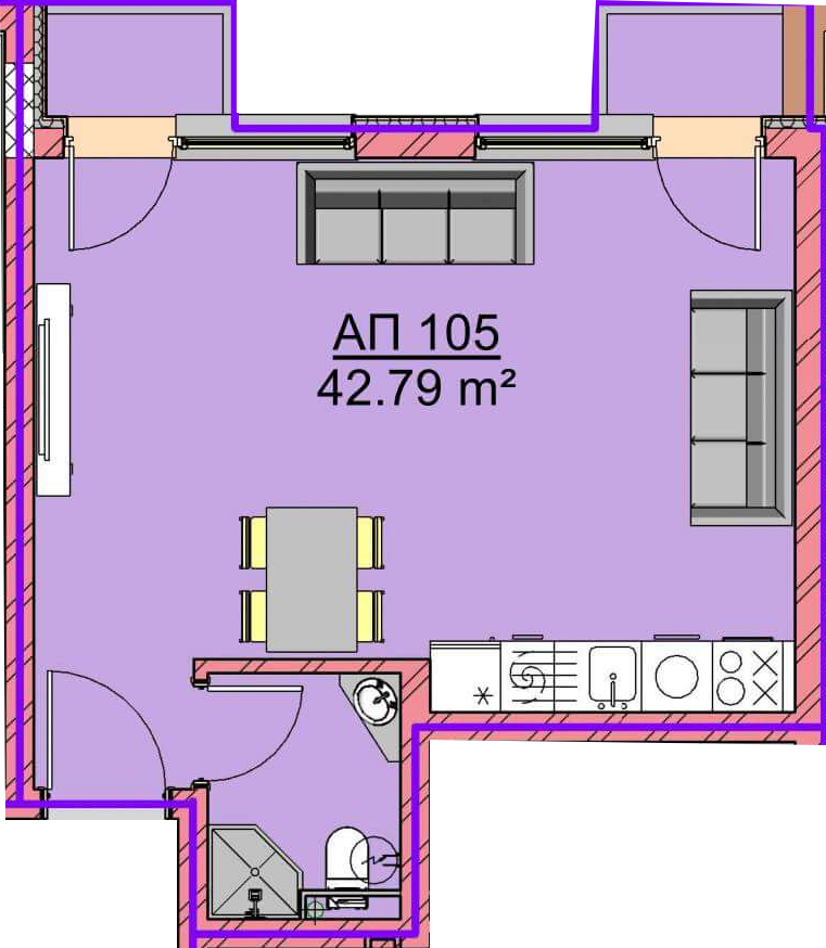 Daire – mutfaklı oturma odası, banyo ve tuvalet, 2 teras.
