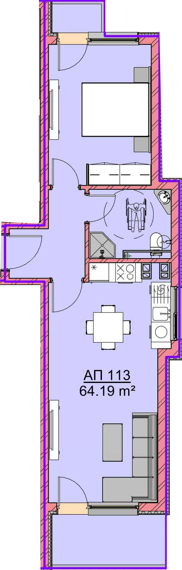 Daire – mutfaklı oturma odası, yatak odası, banyo ve tuvalet, koridor ve 2 teras.