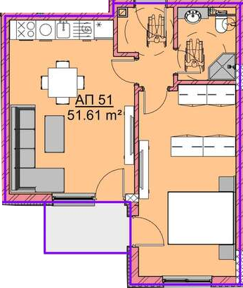 Daire – mutfaklı oturma odası, yatak odası, banyo ve tuvalet, koridor ve teras.