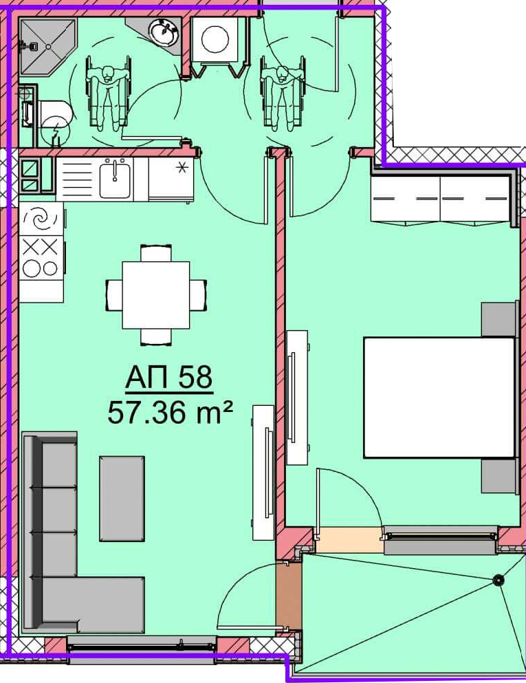 Daire – mutfaklı oturma odası, yatak odası, banyo ve tuvalet, koridor ve teras.