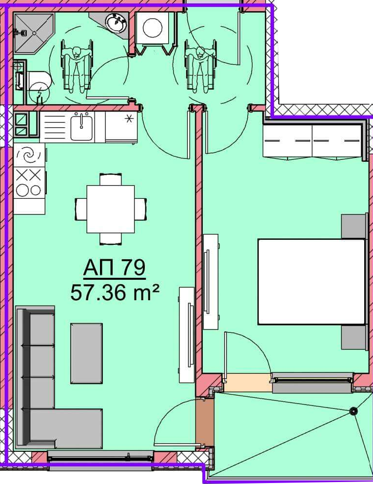 Daire – mutfaklı oturma odası, yatak odası, banyo ve tuvalet, koridor ve teras.
