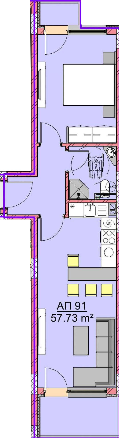 Daire – mutfaklı oturma odası, yatak odası, banyo ve tuvalet, koridor ve 2 teras.