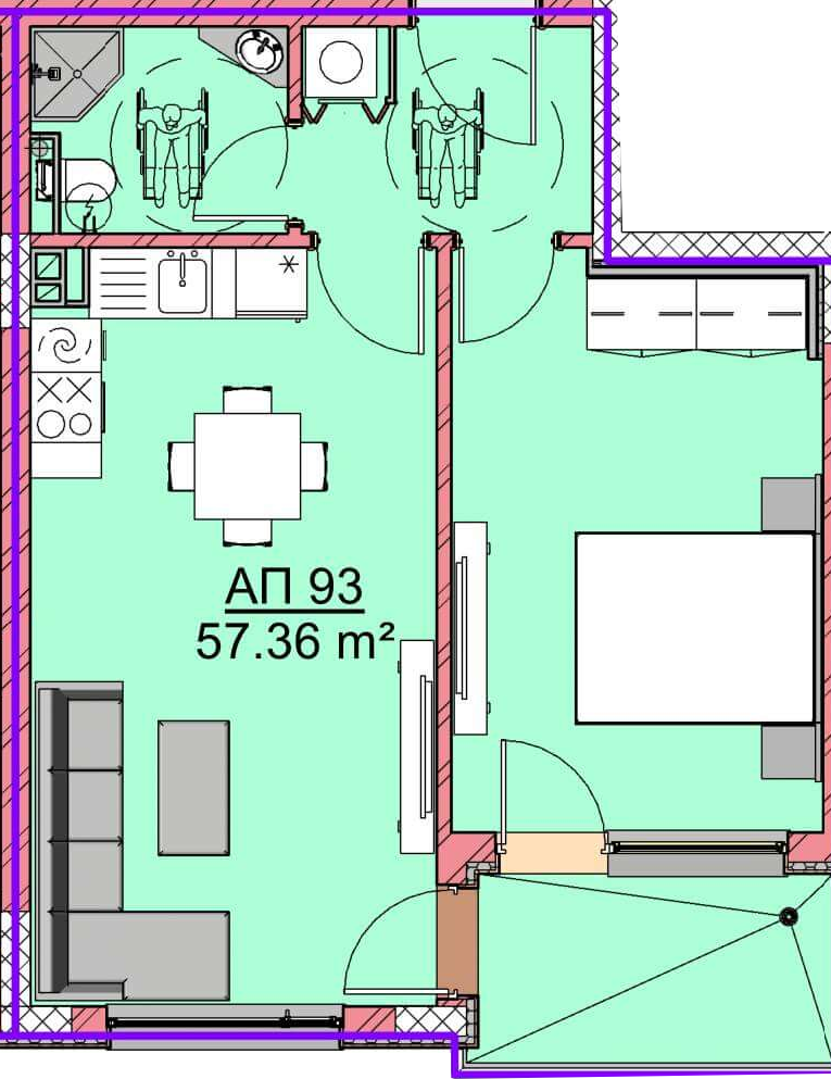 Daire – mutfaklı oturma odası, yatak odası, banyo ve tuvalet, koridor ve teras.